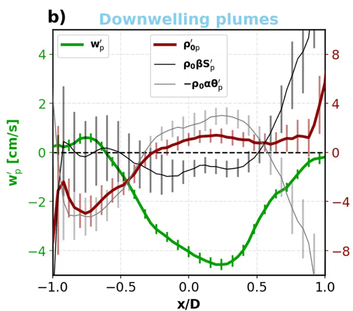 Turbulent vertical velocity measurements are scarce in regions prone to convection such as the Labrador Sea, which hinders our understanding of deep convection dynamics. Vertical velocity, w $w$, is retrieved from wintertime glider deployments in the convective region. From w $w$, downward convective plumes of dense waters are identified. These plumes only cover a small fraction of the convective area. Throughout the convective area, the standard deviation of w $w$ agrees with scaling relations for the atmospheric surface and boundary layers. It initially depends on surface buoyancy loss in winter, and later, on wind stress after mid-March. Both periods are characterized by positive turbulent vertical buoyancy flux. During convective periods in winter, the positive buoyancy flux is mostly forced by surface heat loss. After mid-March, when buoyancy loss to the atmosphere is reduced, the positive buoyancy flux results from a restratifying upward freshwater flux, potentially of lateral origins and without much atmospheric influence.